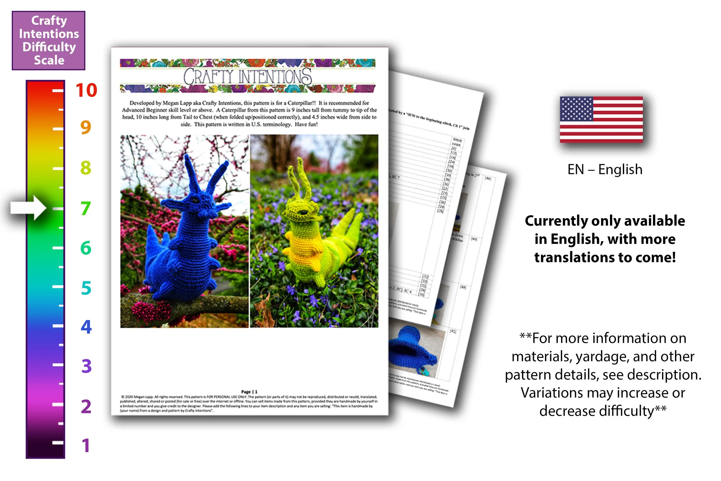 This pattern is 36 pages long with clearly explained instructions for each round and many step-by-step photos. In this pattern there is one body that you can customize with two different face plate options. The caterpillar is made in all one piece except for the face plate. A Caterpillar from this pattern is 9 inches tall from tummy to tip of the head, 10 inches long from Tail to Chest (when folded up/positioned correctly), and 4.5 inches wide from side to side. This pattern is suitable for an intermediate skill level and is rated 7 out of 10 on the Crafty Intentions Difficulty Scale. This pattern is available in English. Purchase by using the links below.